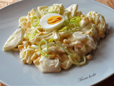 Den Mais abtropfen lassen. Den Käse in dünne Stifte schneiden. Die Eier